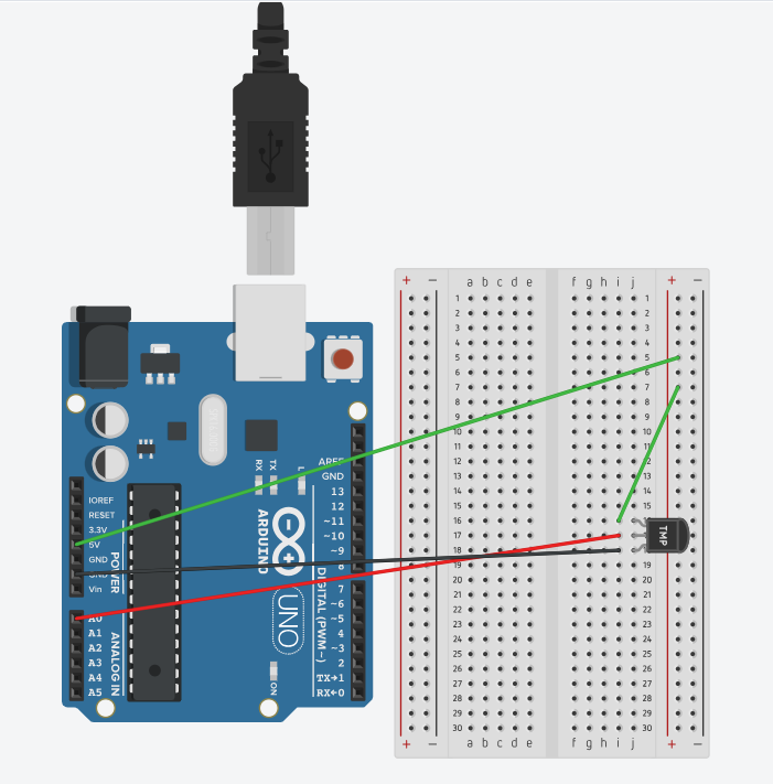 - Читаем значение с датчика TMP36 на A0, переводим в напряжение и вычисляем градусы Цельсия по формуле