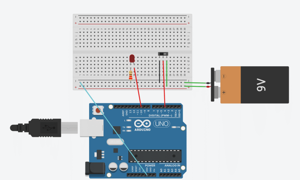 Подключенный к 4 слоту выключатель управляет LED лампой, путем переключения свича. По умолчанию лампа включена. Была добавлена батарейка для автономной работы системы, питание от сети не требуется по итогу.