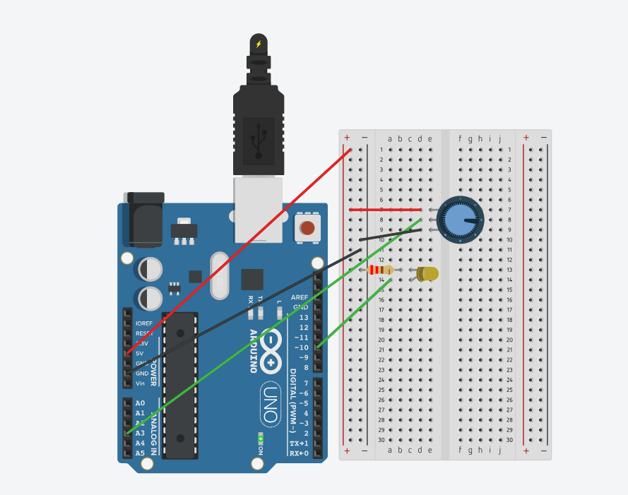 loop()читаем значение с потенциометра наA3(0–1023). - При помощи
