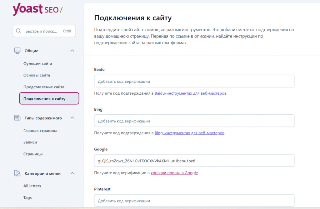 В окне Yaost нужно использовать графу: подключить к сайту. Yoast SEO интегрируется с Google Search Console, где я могу увидеть, какие страницы уже появились в поиске, какие запросы приводят людей на сайт и есть ли ошибки индексации